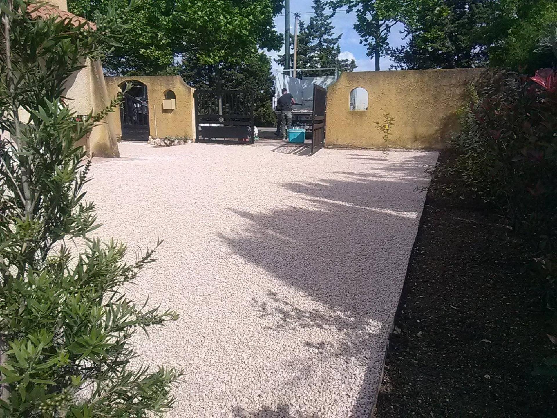 - Compatage, dépose de 4 cm de gravier calcaire de granulométrie 6/10 de chez notre fournisseur King matériaux à Rognac)