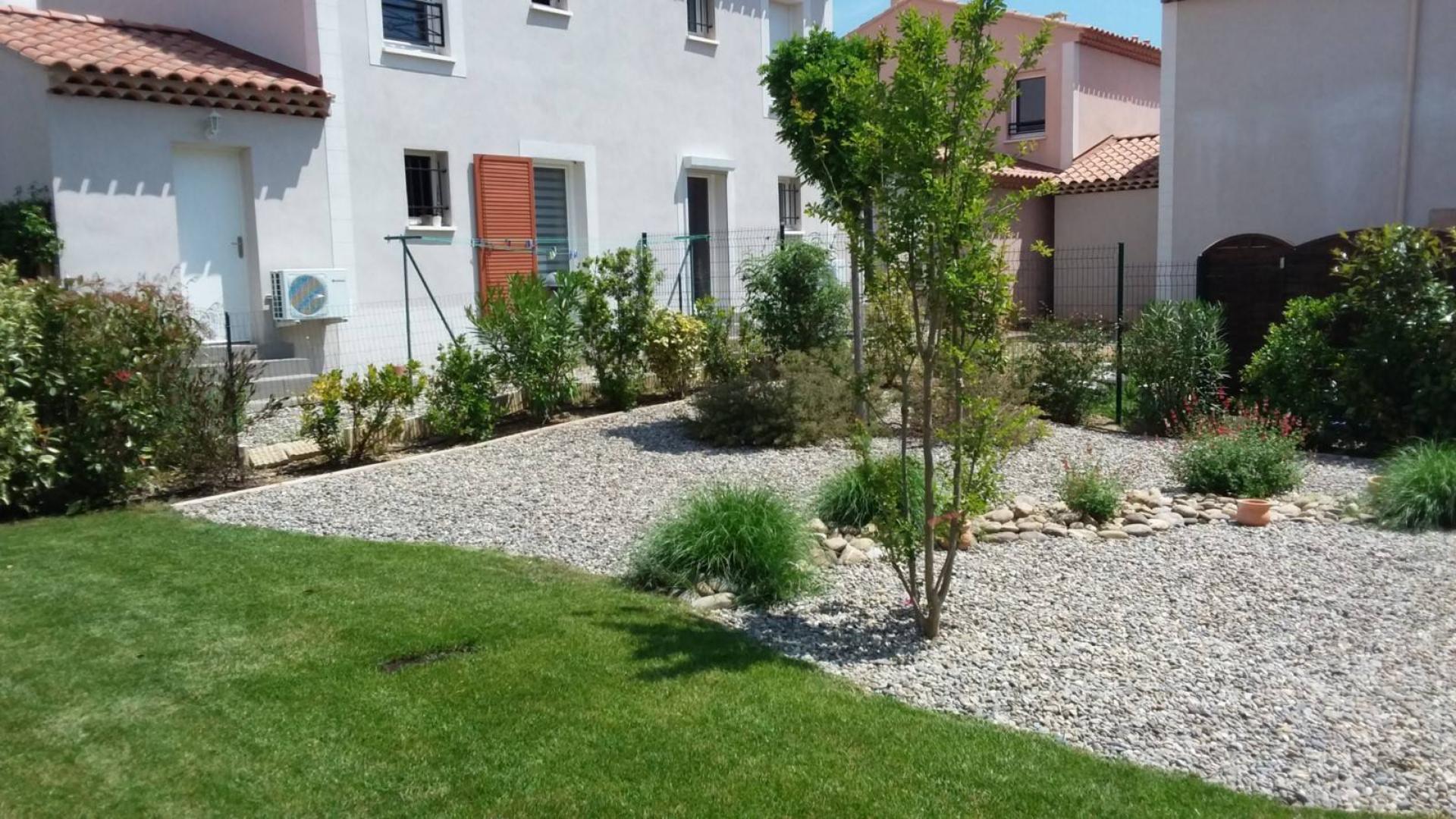 AEP Aménagement Entretien Paysager, votre spécialiste de l’aménagement et l’entretien de vos espaces verts, la pose de clôture et l’installation de terrasse en bois et composite situé à l’Etang de Berre, vous présente l’une de ses dernières réalisations : l’aménagement d'un petit jardin méditerranéen devant une maison avec terrasse à Pelissanne :