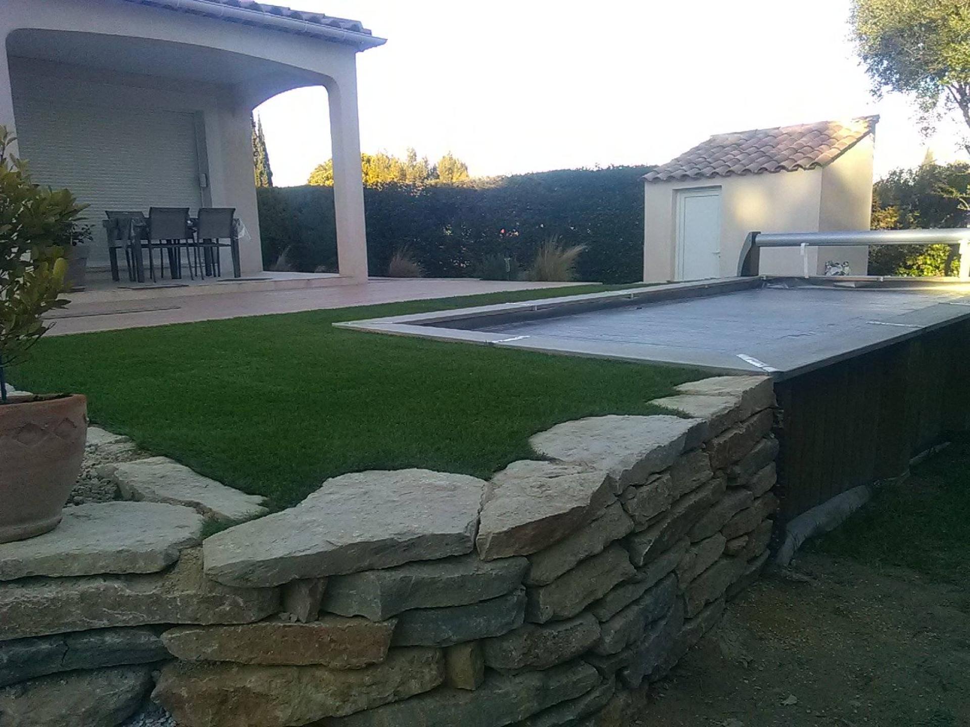 - Habillage avec muret ou enrochement en pierres plates afin de créer une retenue autour de la piscine et assurer un jardin sur 2 niveaux