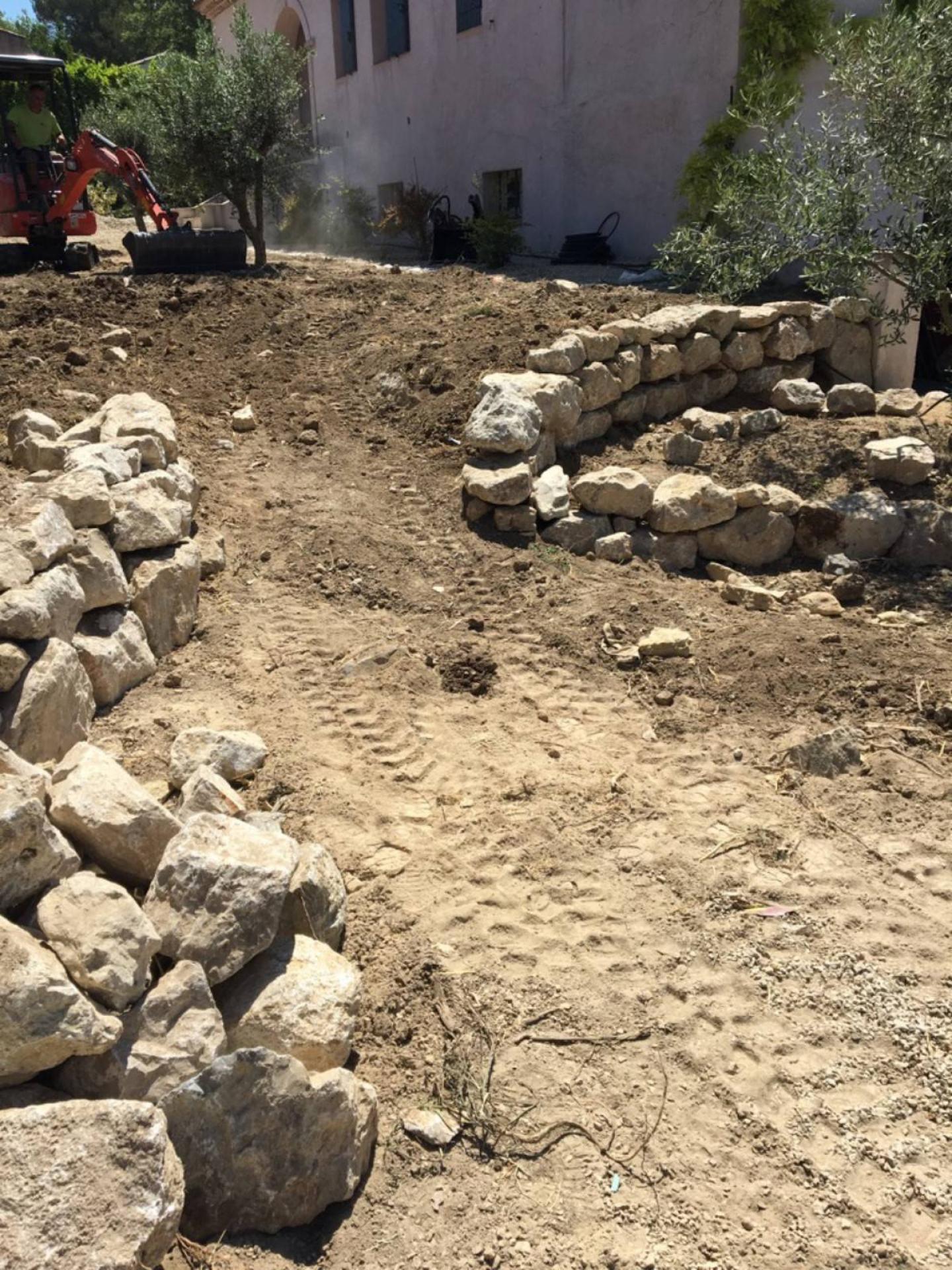 - Réalisé un enrochement avec des pierres de calibre 100-200 afin d'établir une restanque qui séparera la partie parking de la partie piétonne