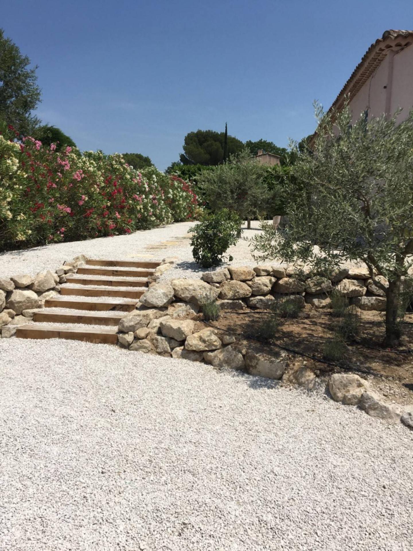 - Posé de généreux pas japonais en pierres de Carcès afin de matérialiser le cheminement piéton jusqu'à la porte d'entrée. Le cheminement a également été accentué par la plantation quelques végétaux méditerranéens (oliviers, abélias grandiflora, nandines, photinias) et des spots lumineux